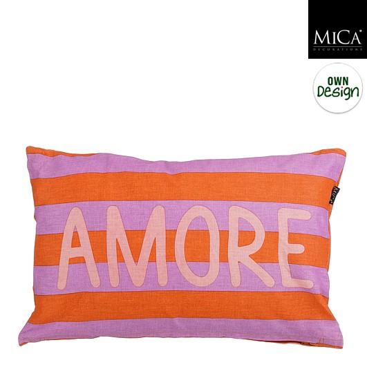 Breng een vleugje Italiaanse romantiek in huis met dit oranje-paars gestreepte kussen van Mica Decorations. De brede strepen en de grote tekst ‘AMORE’ op de voorkant maken het kussen een echte eyecatcher op je bank, fauteuil of bed, perfect om je interieur een warme, speelse uitstraling te geven.