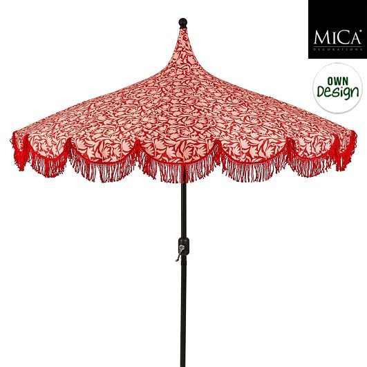 De Kelly parasol van Mica Decorations is perfect! Het speelse bloemenprintje en de sierlijke franjes geven deze rode parasol een charmante, bijna retro uitstraling die meteen opvalt. Perfect voor lange dagen buiten met een goed boek of een verfrissend drankje. Het parasoldoek is gemaakt van stevig polyester en biedt bescherming tegen zon én een lichte regenbui.