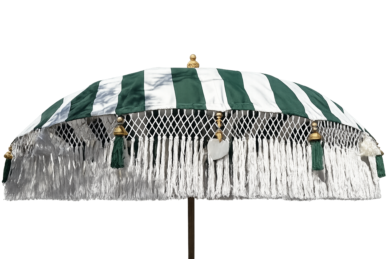 Creëer een frisse en natuurlijke uitstraling in je tuin of op je terras met de Parasol Bali Groen/Wit. De combinatie van helder wit met stijlvolle groene accenten zorgt voor een rustige, tropische sfeer met een luxe bohemian uitstraling. Dankzij de decoratieve franjes en verfijnde afwerking is deze parasol een echte blikvanger in iedere buitenruimte.