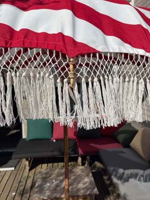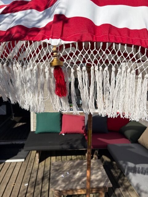 De stevige paal en verfijnde afwerking met decoratieve franjes geven deze parasol zijn kenmerkende bohemian charme. Functioneel én decoratief – ideaal om een exotische en stijlvolle setting te creëren.
