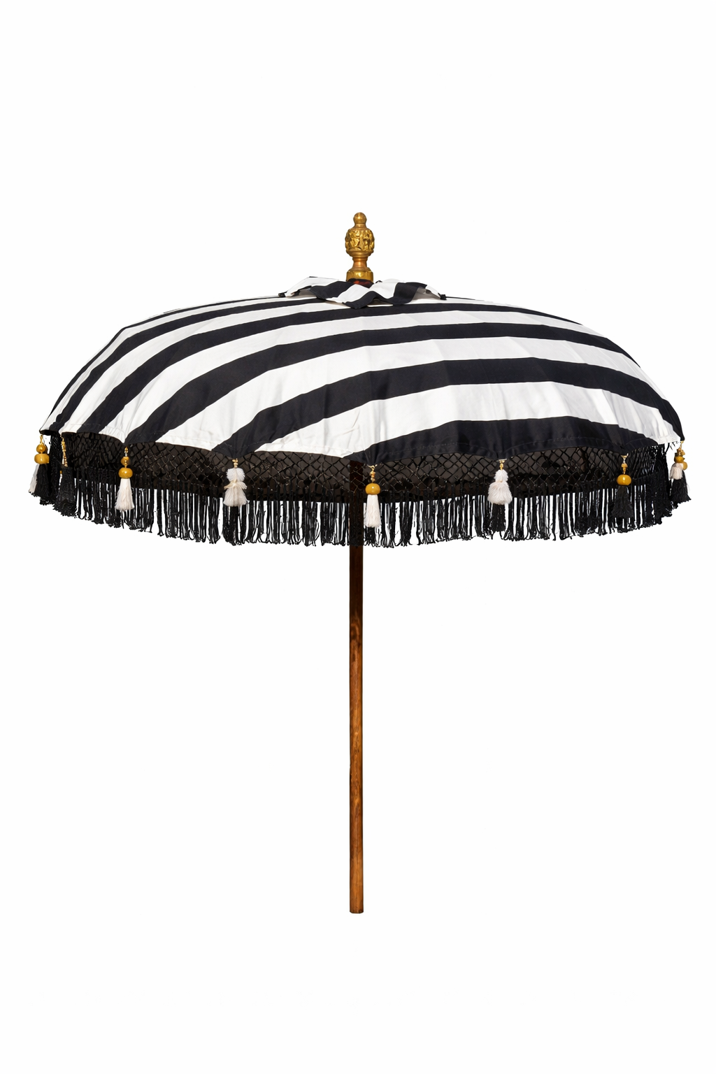Creëer een stijlvolle en moderne uitstraling in je tuin of op je terras met de Parasol Bali Zwart/Wit. De combinatie van helder wit met elegante zwarte accenten zorgt voor een chique, tropische sfeer met een luxe bohemian uitstraling. Dankzij de decoratieve franjes en verfijnde afwerking is deze parasol een echte blikvanger in iedere buitenruimte.