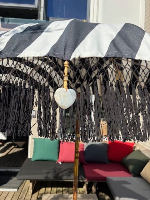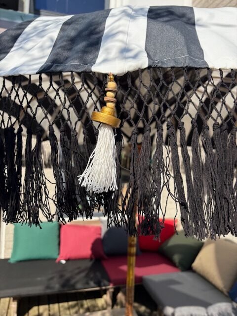 De stevige paal en authentieke details maken het geheel compleet en geven de parasol zijn kenmerkende Bali-charme. Functioneel én decoratief – ideaal om een stijlvolle Ibiza- of tropische setting te creëren.